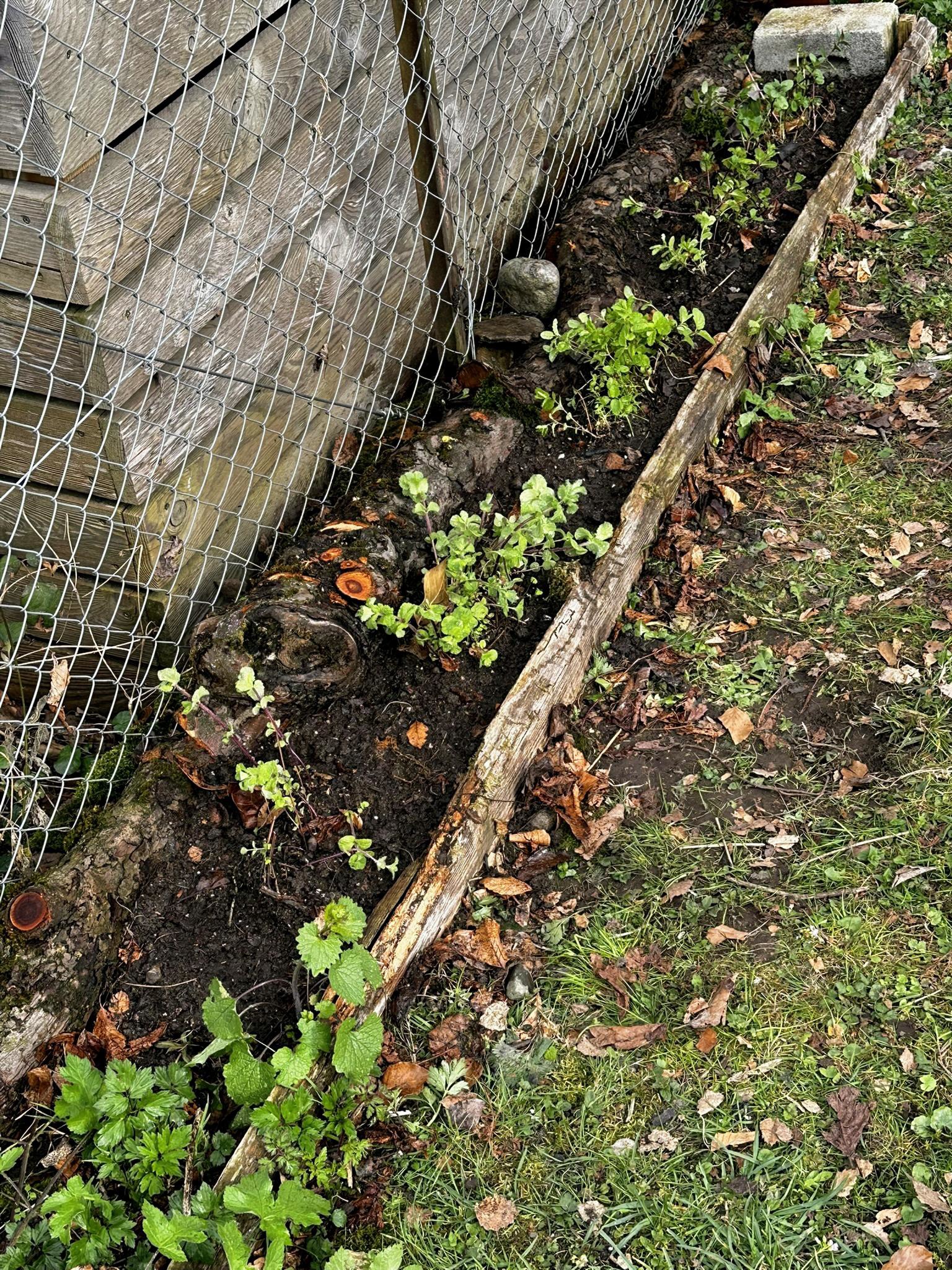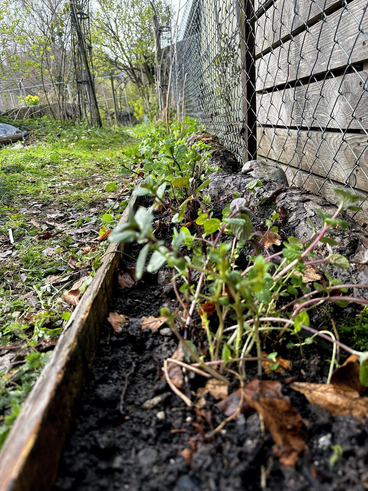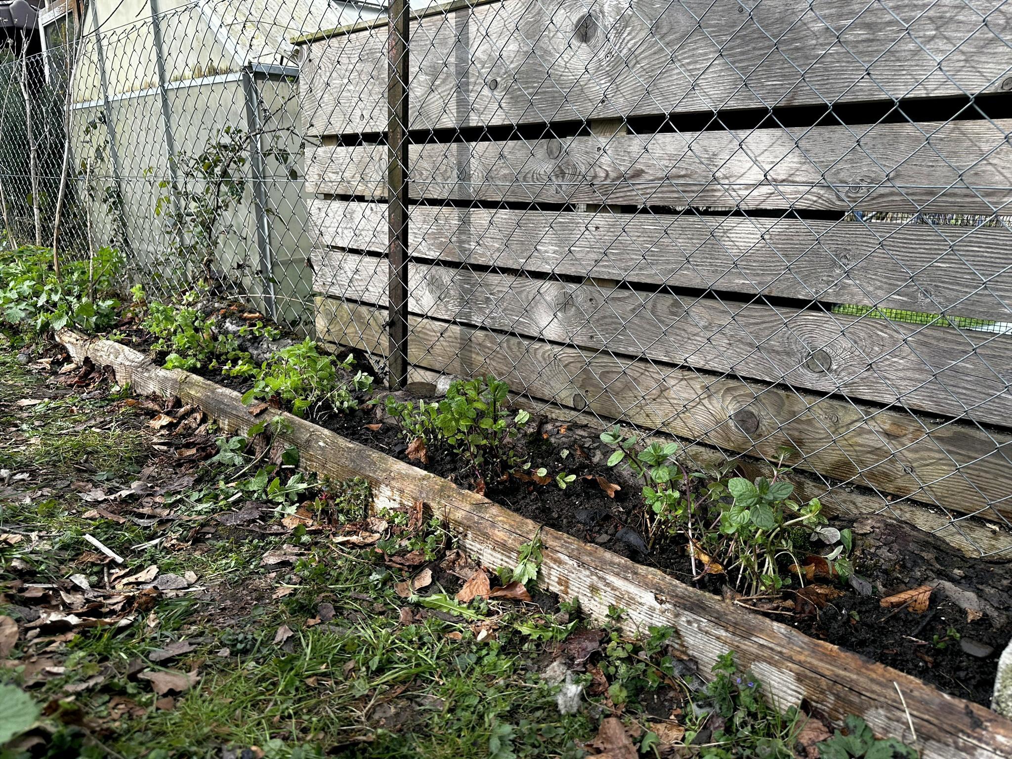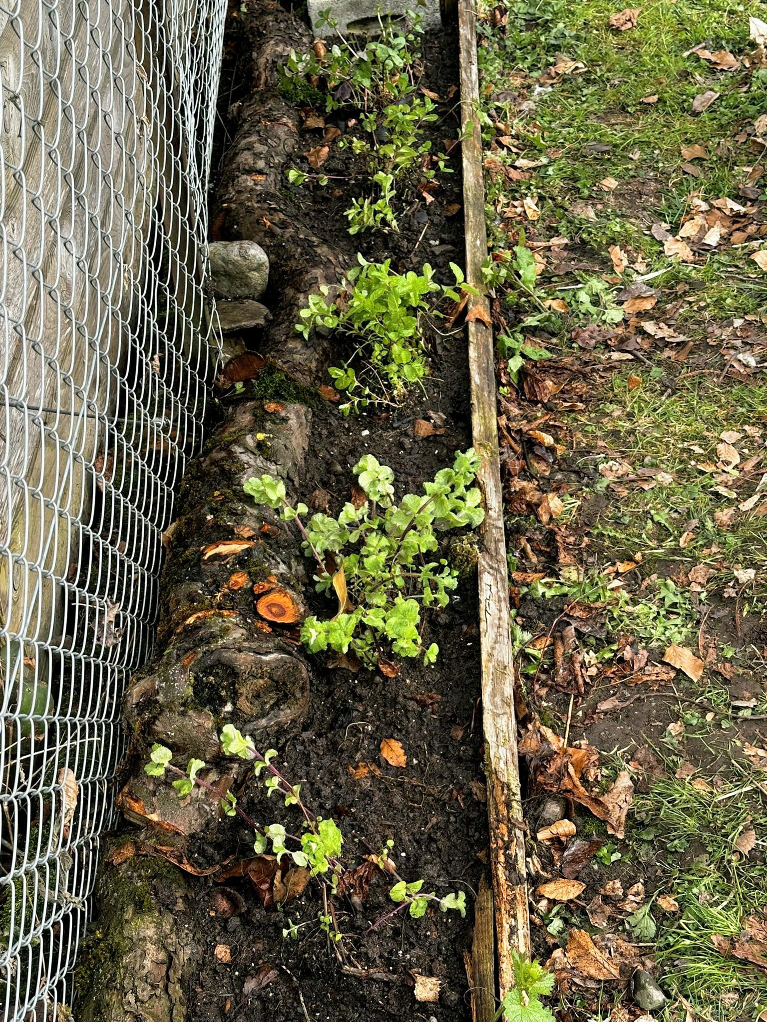 Anschliessend habe ich verschiedene Minzesorten vom Balkon geteilt und die überschüssigen Pflanzen im neu aufgebauten Streifen verteilt. Die Idee dahinter ist einfach: Die Minze soll sich nicht irgendwo unkontrolliert im Garten ausbreiten, sondern gezielt in diesem linearen Raum entlang des Zauns. Das Betonfundament des Zauns, die Holzstücke auf der Rückseite und der Holzrand an der Front schaffen dafür eine natürliche Führung. So entsteht ein begrenzter Wurzelraum, in dem sich die Minze entfalten darf, ohne gleich den halben Garten zu erobern.