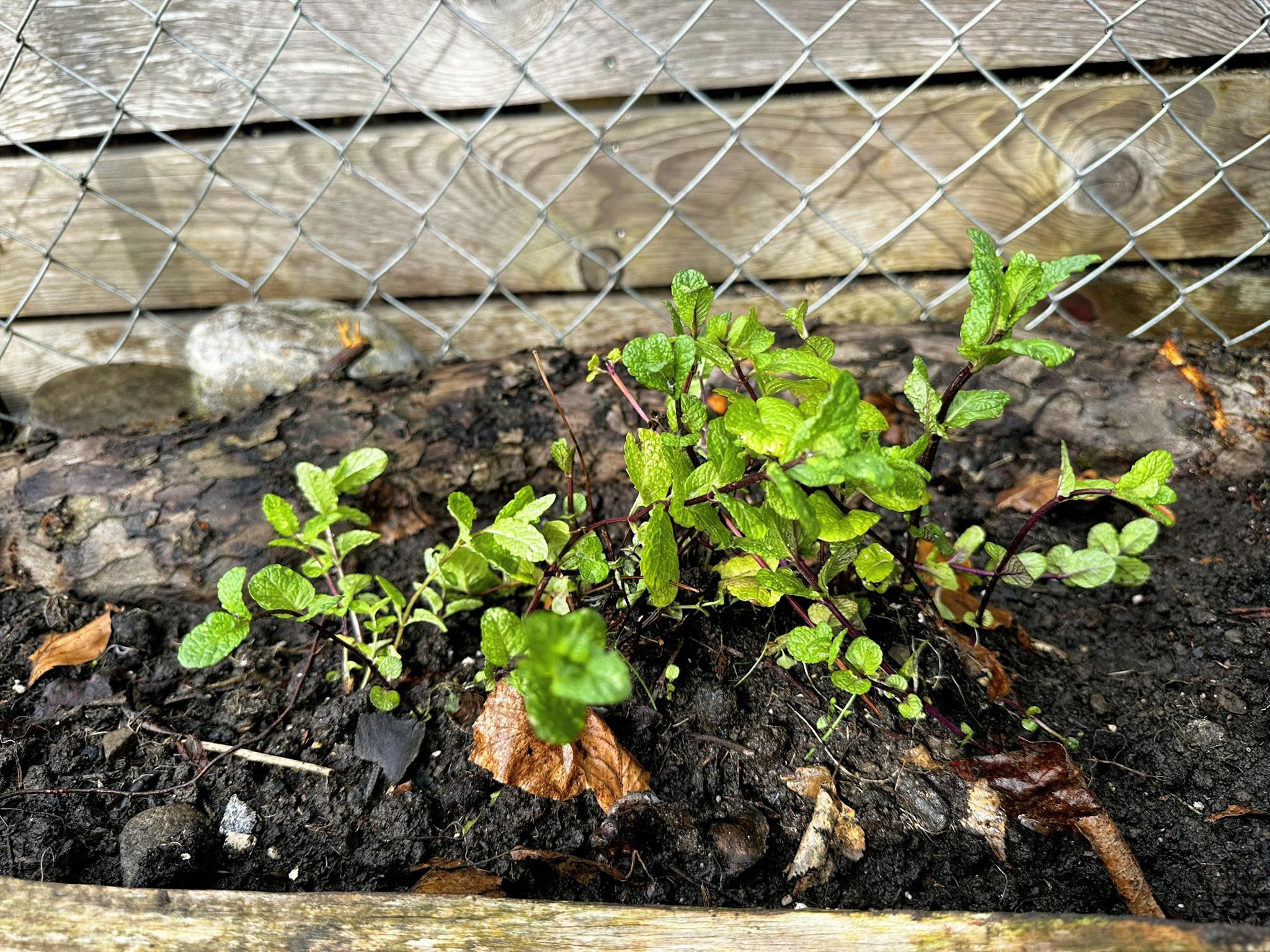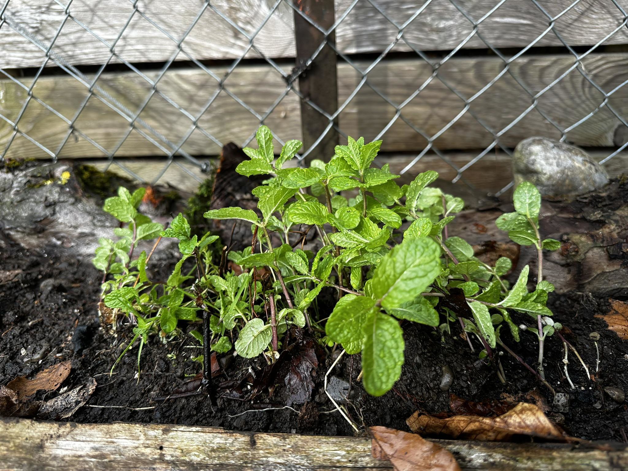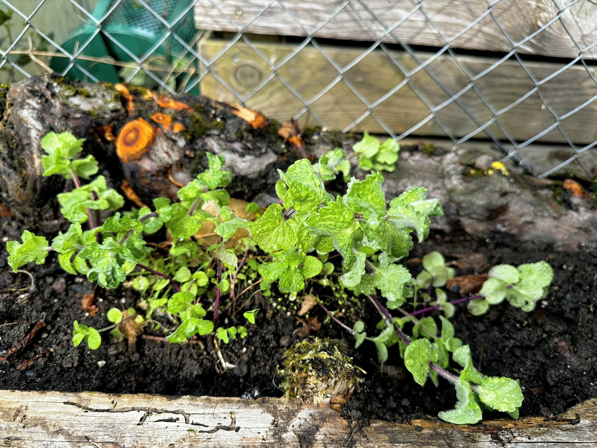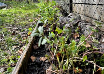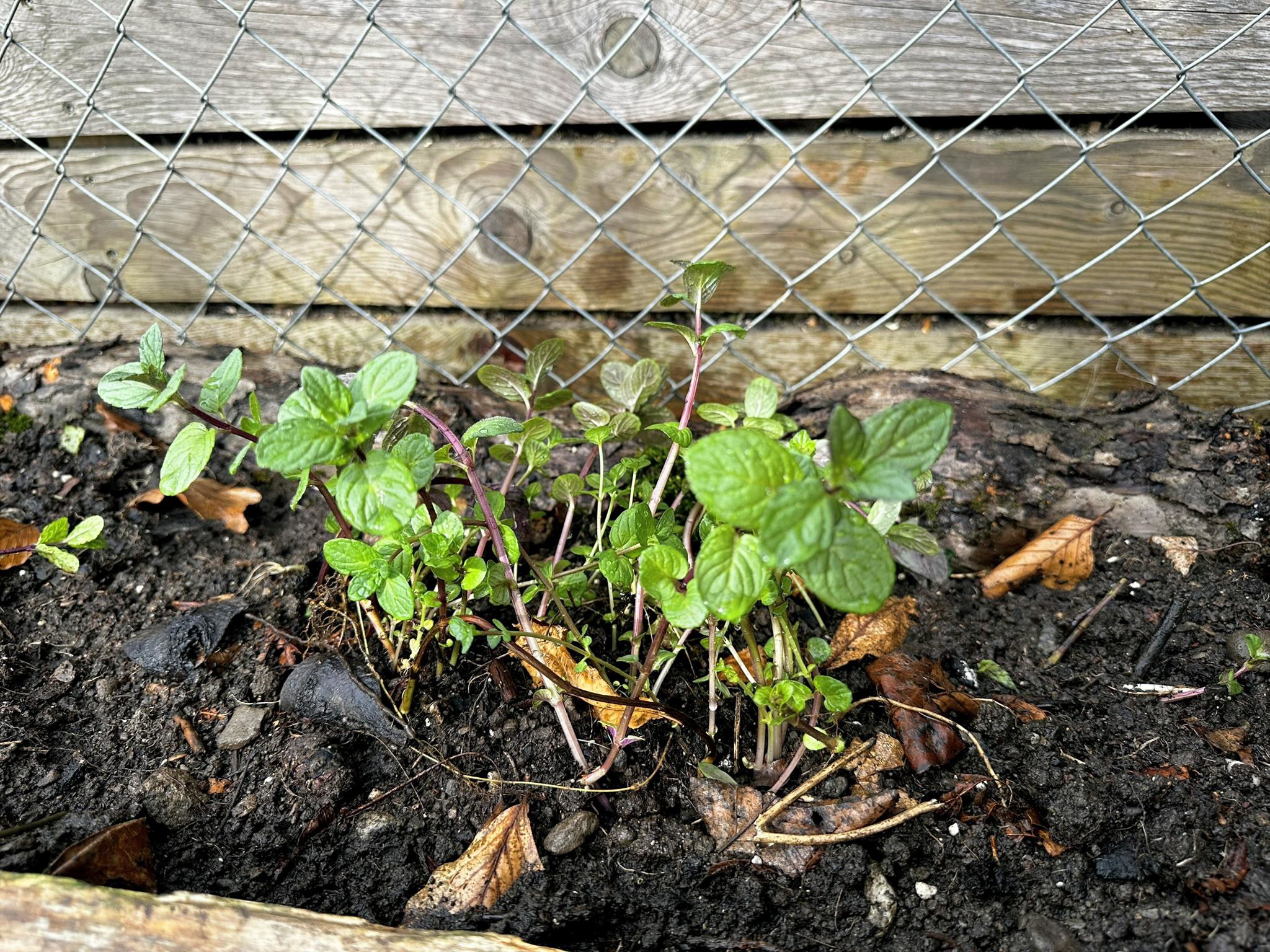 Anschliessend habe ich verschiedene Minzesorten vom Balkon geteilt und die überschüssigen Pflanzen im neu aufgebauten Streifen verteilt. Die Idee dahinter ist einfach: Die Minze soll sich nicht irgendwo unkontrolliert im Garten ausbreiten, sondern gezielt in diesem linearen Raum entlang des Zauns. Das Betonfundament des Zauns, die Holzstücke auf der Rückseite und der Holzrand an der Front schaffen dafür eine natürliche Führung. So entsteht ein begrenzter Wurzelraum, in dem sich die Minze entfalten darf, ohne gleich den halben Garten zu erobern.