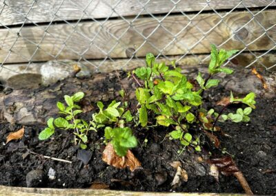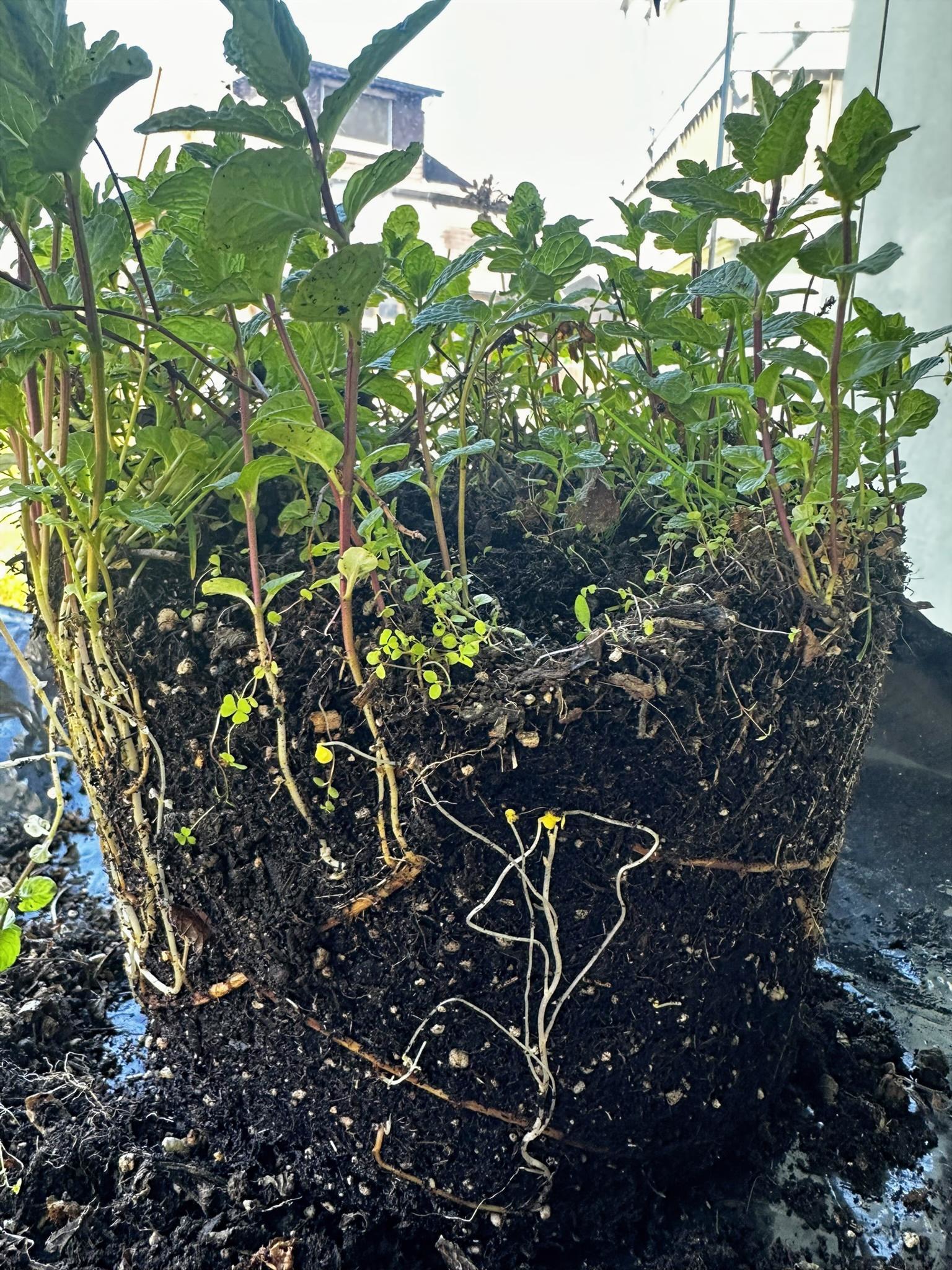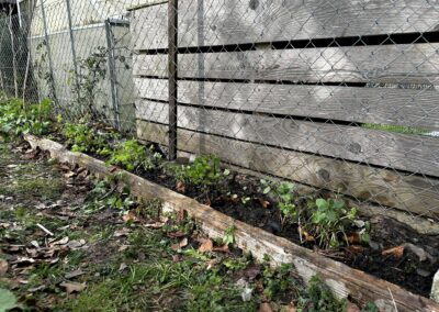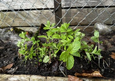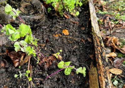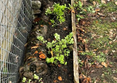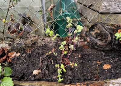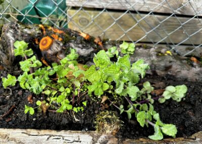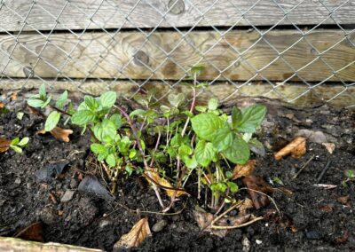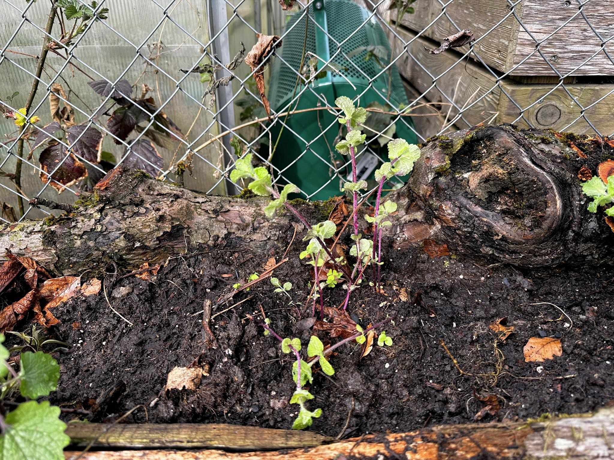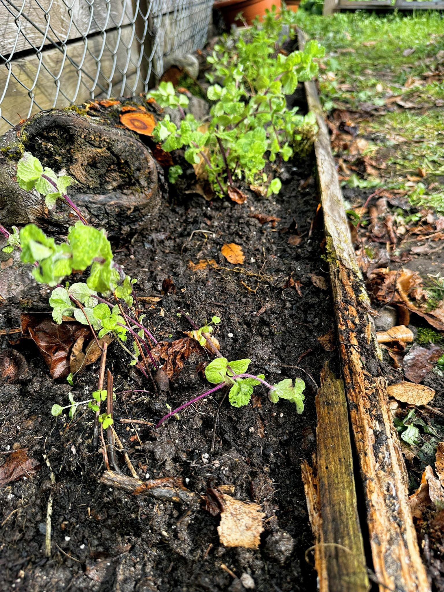 Anschliessend habe ich verschiedene Minzesorten vom Balkon geteilt und die überschüssigen Pflanzen im neu aufgebauten Streifen verteilt. Die Idee dahinter ist einfach: Die Minze soll sich nicht irgendwo unkontrolliert im Garten ausbreiten, sondern gezielt in diesem linearen Raum entlang des Zauns. Das Betonfundament des Zauns, die Holzstücke auf der Rückseite und der Holzrand an der Front schaffen dafür eine natürliche Führung. So entsteht ein begrenzter Wurzelraum, in dem sich die Minze entfalten darf, ohne gleich den halben Garten zu erobern.