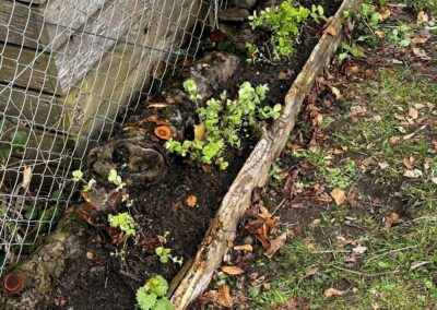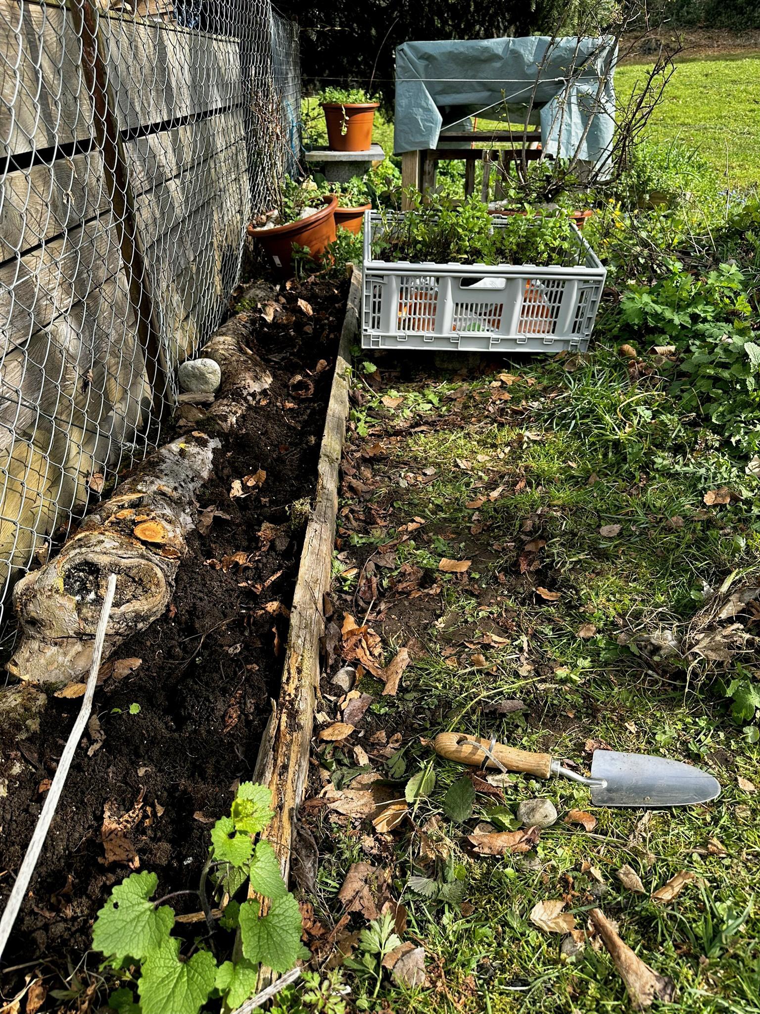 Heute habe ich diesen Streifen neu aufgebaut. Parallel zum bestehenden Beetrand an der Vorderseite entstand entlang des Zauns eine zusätzliche Rückwand aus gefälltem Holz vom Hof-Umschwung. So konnte der Erdaufbau angehoben, stabilisiert und besser gefasst werden. Statt neues Material von aussen zu holen, kam also genau das zum Einsatz, was vor Ort vorhanden war – schlicht, sinnvoll und im besten Sinn kreislauforientiert.